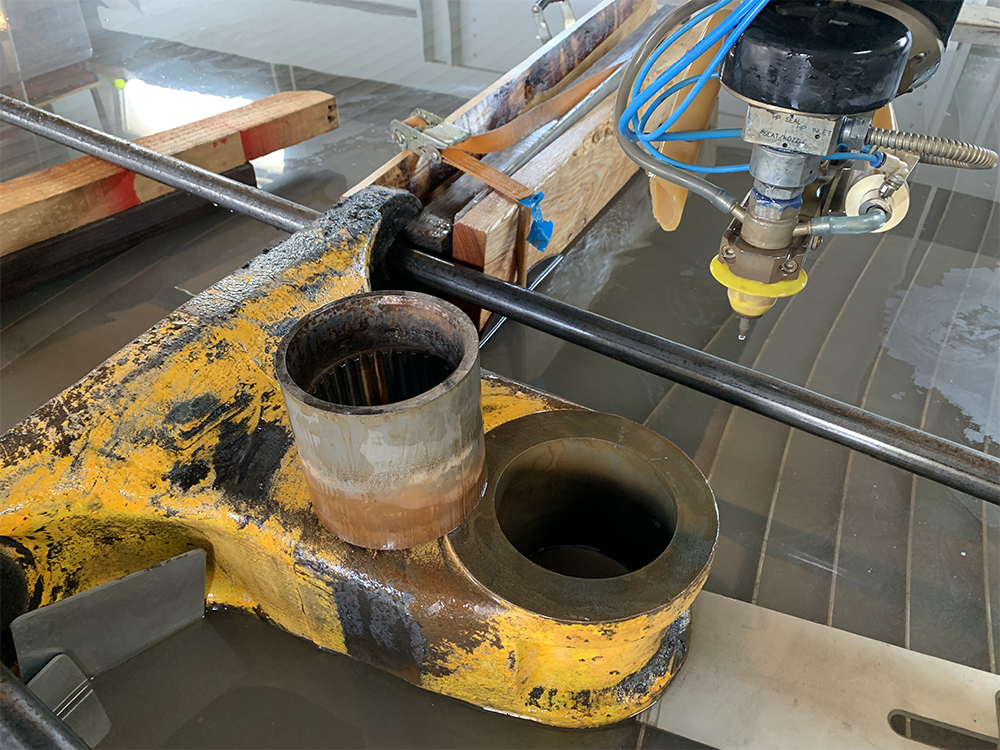 Opäť sme postavili náš vodný lúč Flow Mach 200 pred výzvu: nahradiť opotrebovanú alebo pokazenú časť bagra, ktorú naši zákazníci potrebujú pri svojej práci. Vyrezali sme ozubenú časť z uloženia hydraulického ramena bagra a nahradili ho novým, ktorý sme taktiež vyrezali za pomoci nášho vodného lúču. Tie sa potom zvárali dohromady.
